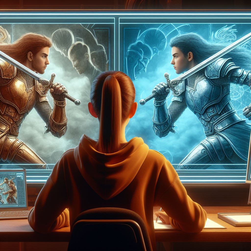 The air crackled with tension as the clash of swords echoed through the chamber. The torchlight flickered in rhythm with the intense duel, casting dynamic shadows that danced along the ancient walls.