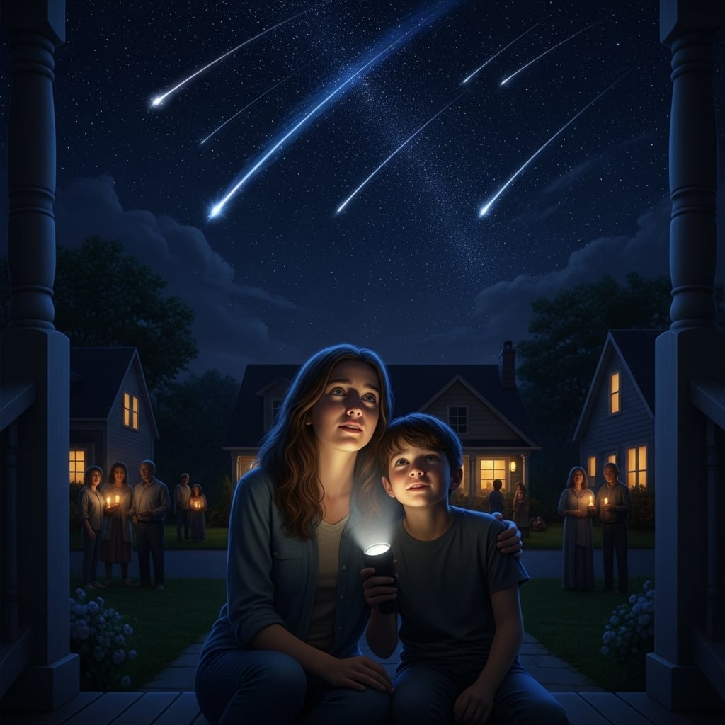 Someone pointed upward, and gasps rippled through the group. Shooting stars streaked across the sky in silver arcs, one after another. A meteor shower—brilliant, dazzling, endless. The blackout had revealed a hidden universe.