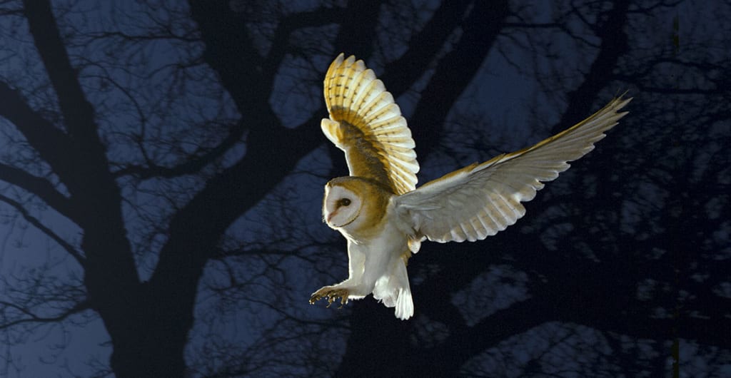 I don't know how long I had been there, time came to a stop. I was clueless to the time. I also didn't have my phone with me, it was still in the car. As I stood there pondering my situation, I was startled by a large, black apparition. Then with a flap in the wind it disappeared. I couldn't be sure if what I thought I saw was real or just the remnant of a bump on the head during the rollover. I couldn’t even be sure of what it was when the silence was broken by an eerie “whoo…..” and in an instant the black shadow again flew past me. This time though it stopped in the trees behind me. I turned, slowly, to see what it was. I wasn't sure I wanted to know but I looked in the trees and I could make out a large figure. I stood there staring, trying to figure out exactly what it was I was looking at when again I heard the eerie “whoo….” This time it was much louder and appeared to come from the “thing” that sat in the tree, a good 20 feet above me. It turned its head to reveal a large, round white face. A brown ring circled its face and two large black piercing eyes were staring at me. It was an owl, a large barn owl. It continued to stare at me, its large eyes blinking. It stood deathly still. I was bigger than the owl, but I couldn't help but wonder if it thought of me as just another item of prey. I knew that owls ate rodents and such, but how hungry this one was I had no way of knowing. We stared at each other for what felt like an eternity then with a leap and the flapping of its giant wings it took off through the branches.