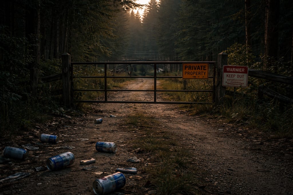 They had to park short of the bridge. A locked cattle gate blocked the way now, warning signs nailed crookedly into posts. Someone joked about liability. Someone else complained. They climbed out anyway, beers already cracked, flashlights swinging uselessly at their sides.