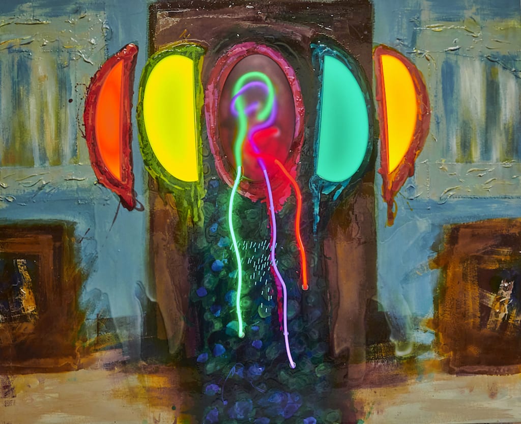 The face and the front of the painting burst into life. Three dribbles of neon, red, blue and green, hung down, defining the body, casting their coloured shadows on the paintwork beneath. Above, the face turned to a mass of writhing neon snakes, like the ornaments on Anglo-Saxon manuscripts, trying to bite one another’s tails.