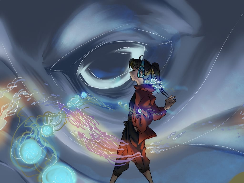 Slowly, she raised her arms, a movement so graceful that San did nothing but watch in awe at the scene before her. The girl opened her mouth, and out of her mouth came a soft, yet resounding, chant, sounding almost like the whispers of waves and winds.