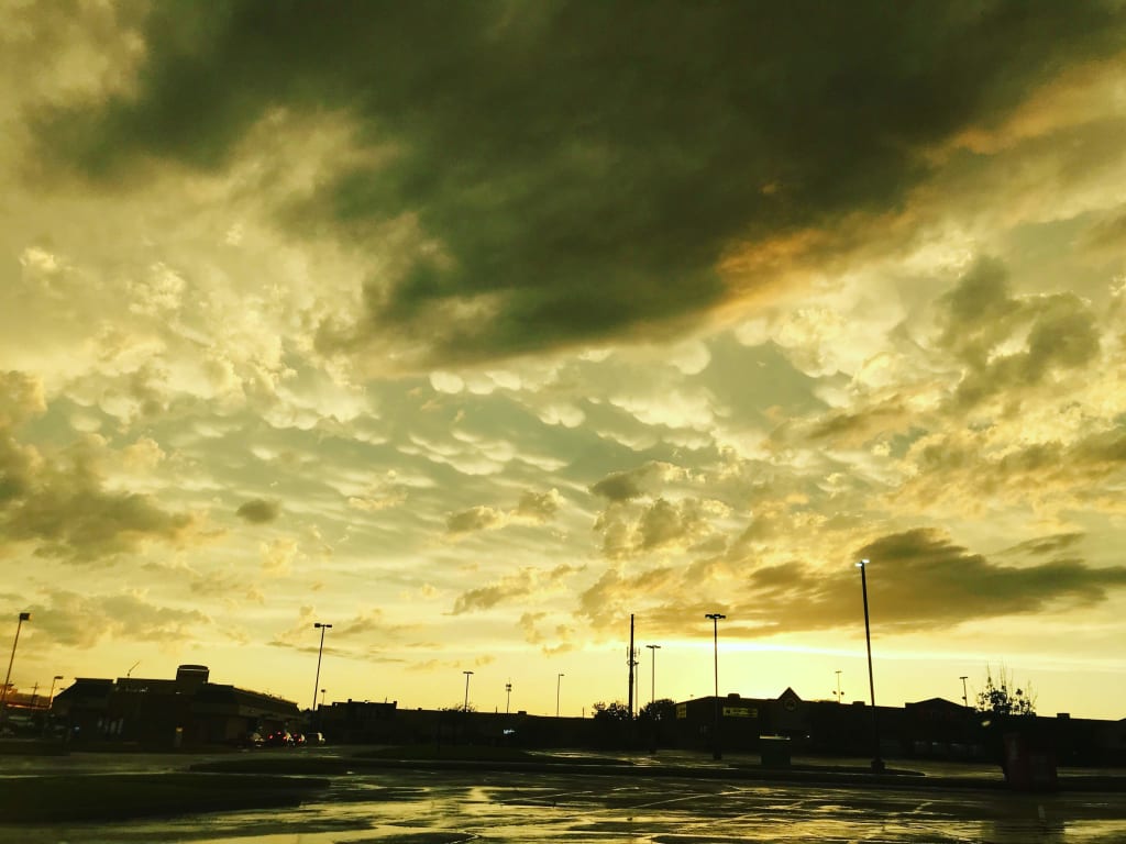 She hoped it was just another thunderstorm but then she saw another flash of green light, this time it was closer, a few miles away. She saw what was approaching and then heard the distant sirens in town blaring a warning to take cover. It was building rapidly as it began ripping up the earth and tossing debris into the air, it was a tornado.