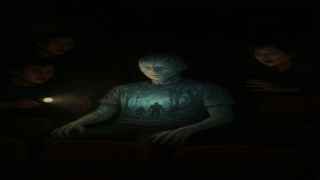 The movie we had just shown (some dumb found-footage horror flick) was flickering across him. Every frame. Every movement. Playing on his face, his chest, his arms as if he were a living screen. The sound wasn’t there, but the visuals were unmistakable—characters running through the woods, the shaky camera, the monster popping into frame.