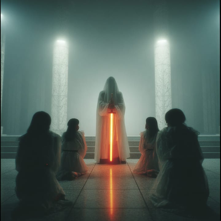 The daughters breathe in and release one last time. The High Priestesses veil burns out, slithering smoke rises to the rafters. The daughters stand in silence. The molten blades dim one by one until the hall is a dwell of simmering dark.
