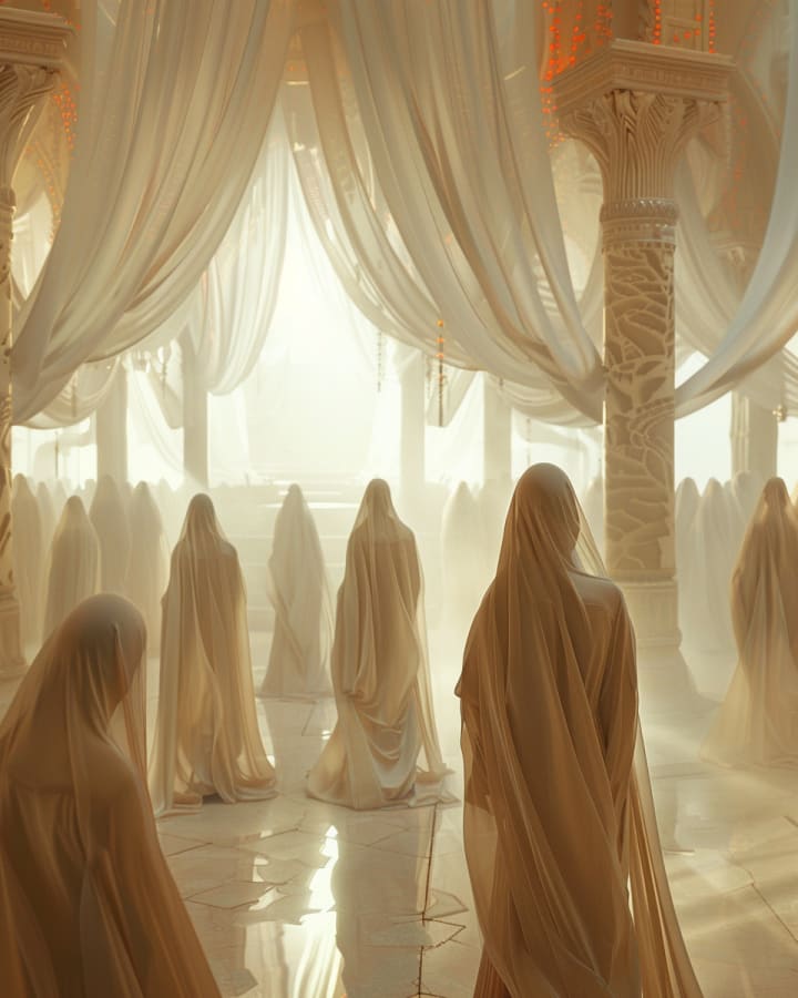 The High Priestess stands at the head of the gathering. Her veil is woven from ash-silk and mica; fingers of light pass through it like moonlight through smoke. It does not hide her face—it hides her reflection. No woman may look upon her own likeness during the Breath Rite. The first heretics learned that mirrors could wake the Hollow Ones, the nameless voices. And so, the Dominion forbade reflection.