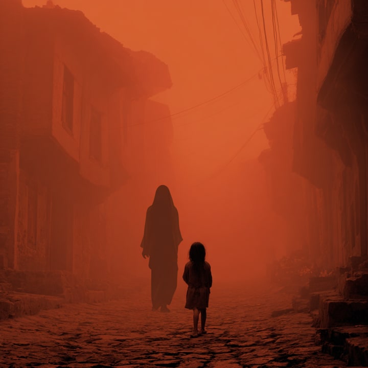 From here, she can see the clouds of crimson drifting the paths, wrapping the towers in a slow, spiraling motion. The bells of the morning ring hollow—dissonant.