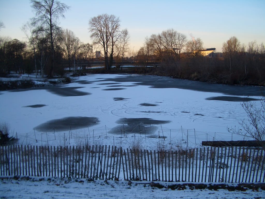 The thin blanket of snow over the pond was disturbed only by my footprints from the night before, barely covered by the sparse snow that came this morning. I inched my way across the ice, carefully tuning my ears to hear any shifts in the surface. Tiny cracks scaled their way across the ice. I stopped. The hole in the ground where I had fallen in was several feet away. Carefully, cautiously, oh so slowly, I approached the edge. Peering down through the murky water, I caught a glimpse of red swaying.