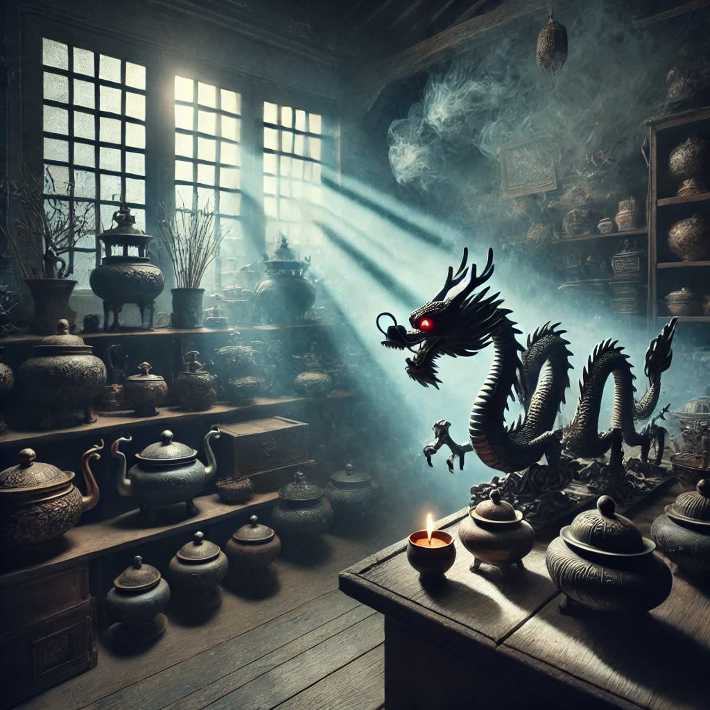 The whispers grew louder, emanating from the Dragon Incense Burner. They spoke in tongues long forgotten, voices intertwining like the dragons carved into its sides. Heart pounding, Old Man Chen leaned closer, trying to decipher the ancient words. The air around him chilled, his breath visible in the moonlight streaming through the window.