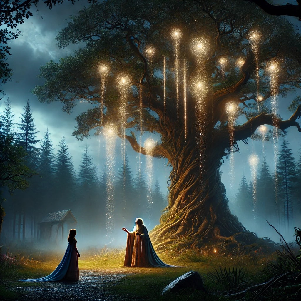 There in the center of the glade was an ancient tree, magnificently beautiful, with shining orbs of light showing along its limbs. At the base of this tree sat the Rainmaker, both awesome and graceful, while around her person shimmered soft mists.