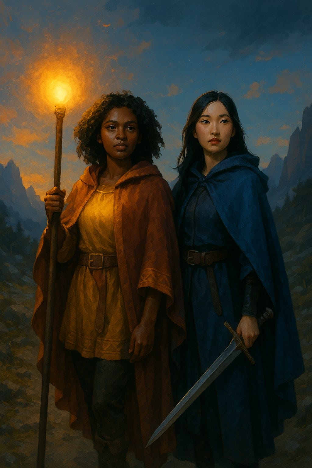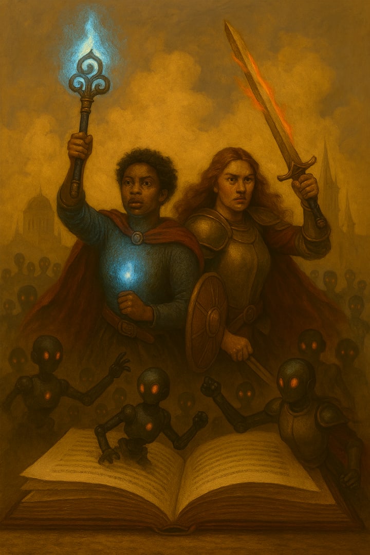Together, they emerged from the pages...literally. The parchment curled and cracked, releasing them into the present. Their capes billowed with the wind of unwritten futures. Behind them, the Dragon, Elves and Scribes of Medlacov rallied, their pens glowing, their scrolls unfurling like banners.