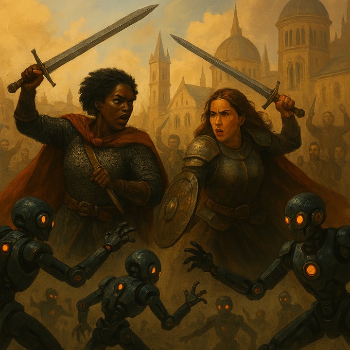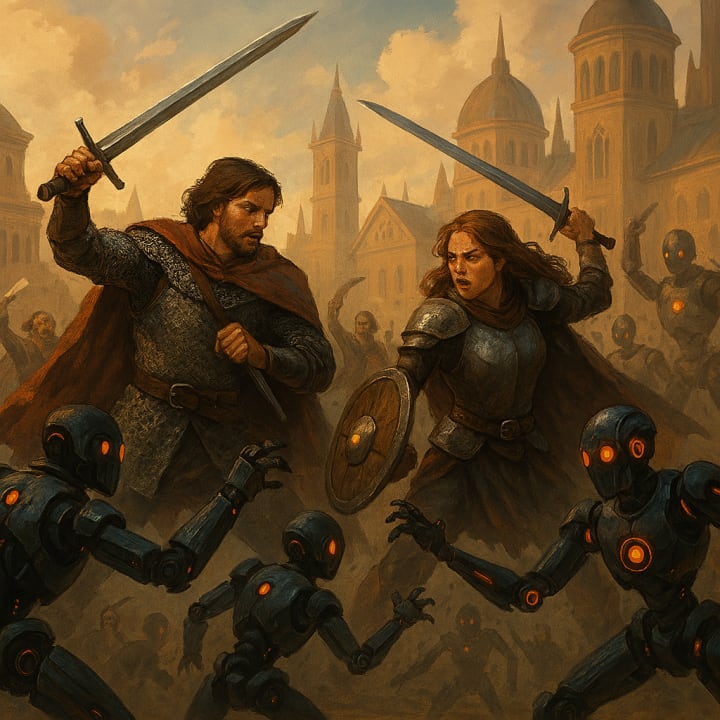 The battle raged across the Scrollfields and through the Syntax Spires. Bots fired logic loops and data storms; the creators countered with paradoxes and passion. Tiffanor struck down a bot with a haiku so perfect it caused a system crash. Sheenora whispered a tragic monologue that made a whole battalion of bots weep and short-circuit.