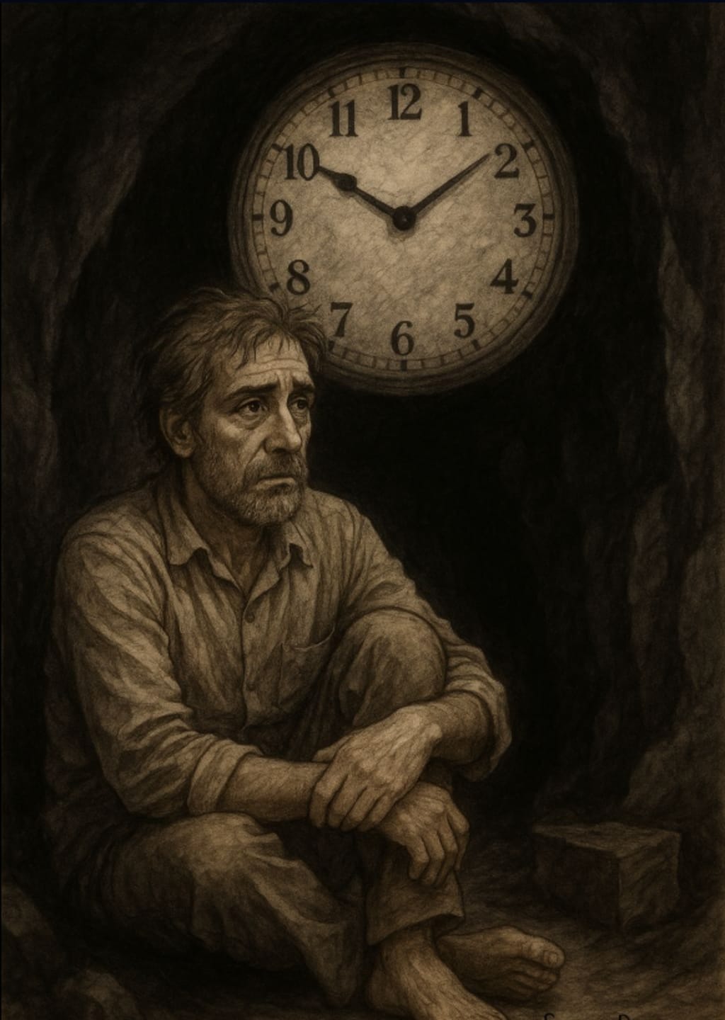 Time inside the cave was immeasurable. There wasn't even an image of a clock like the one shown in the picture. He would eat, drink, and sleep as /when he was hungry/drowsy. At first, he tried to become accustomed to the new daily routine outside. But gradually, his sense of time began to alter. Hours felt like minutes. Days froze together. Was it day? Night? How many hours had passed? He had no idea.
