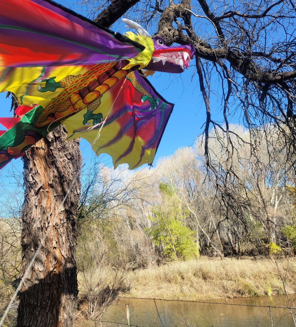 Luck flew directly back to the riverbank hoping the child had not been lost again. There he found it, his Sun-child, running back and forth across the embankment dragging something on a string. It was made of green and white fabric with sticks to support its shape. It was a toy painted like a dragon and the Sun-child insisted that it would take flight if only there were enough wind. Luckvalon was unsure. As much magic as he had witnessed and as many marvelous wonders of nature he had beheld, he had never seen an inanimate object without an engine take flight.