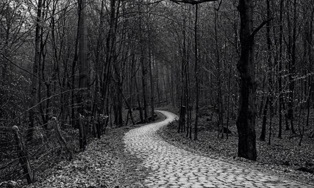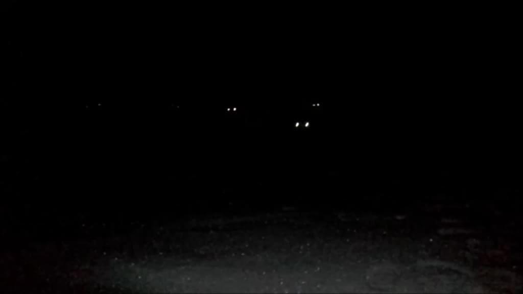 Suddenly the men understood. The unnatural silence was unnerving. The only thing breaking the dreadful quiet was Shimly's lantern shaking from his trembling hand and the sound of the horses breathing. Rygon and Shimly unsheathed their swords and Vooli drew his bow as they assessed the area. Eventually Shimly turned his latern to his right and faced down toward the slope leading to the pond. To his dread he saw the creatures two glowing eyes far closer to him than he could have expected. It was only two arms lengths away from him hidden in the darkness laying in the brush on the slope. He was petrified. He could conjure no sound other than his hand shaking the latern, rattling louder and louder as he grew more terrified. Vooli, unwise to Shimley's situation, lifted his lantern up to look directly above him only to discover that perched on a branch over their heads was another creature glaring down at them. At the same time Rygon started to faintly hear the sound of something galloping towards them, getting louder and louder.