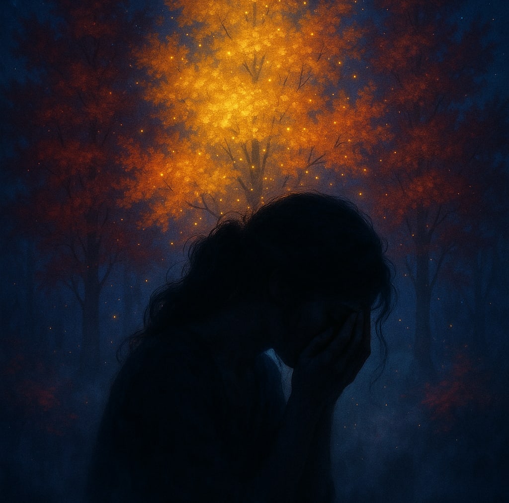 As the billowing fog clears, she is acutely aware of the stilling silence around her. No festival, no sounds of joy, no beautiful glowing of leaves. Instead, sorrow. A soft crying that tugs at her chest. She looks back. The darkness swallows the spot where the figure was; now, another lies motionless on the ground. She felt her body move forward. This shadow of a figure almost trying to take shape as she approached. Something…familiar. Someone…important to her. Someone…