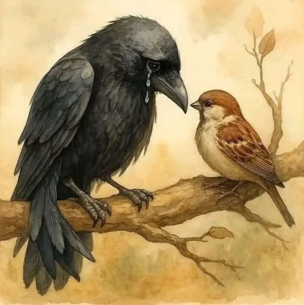 Time passed. The crow could not move, and the sparrow did not give up. It offered bites of food, stories of life in the woods, and warmth on cold nights. When at last the crow stroked out with its wings again, its first thought was for no more than its nothing self, but for the small companion that had grown dearer than anyone else.