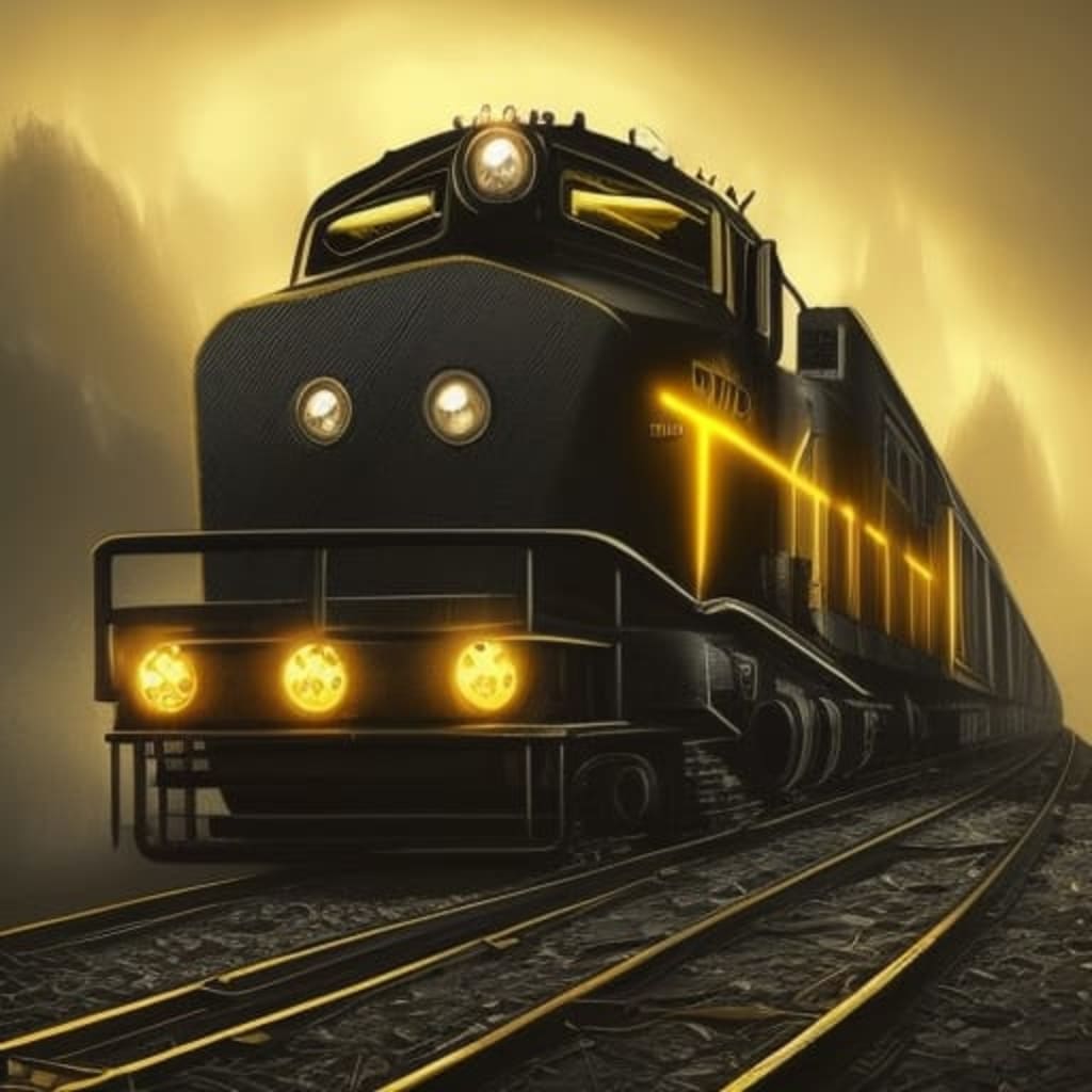 He looks into the distance and can see a long line of railcars attached to the black and yellow engine. They are bright yellow with a black streak running under a bank of black-tinted windows. The yellow paint appears to emit light instead of reflecting it.