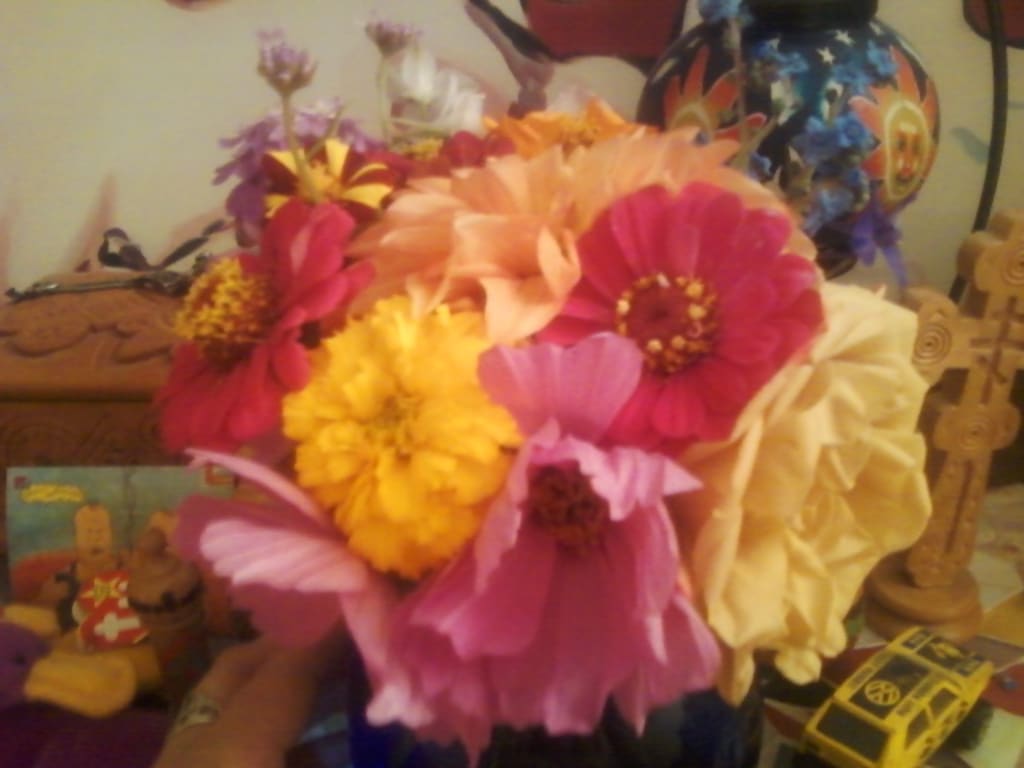 Not long after seeds began to germinate and the flower and vegetable garden began to grow and proliferate. Spring turned to summer and soon we were getting blooms in our flower garden and harvesting some vegetables too. I would go out and water the garden, watch for pests, pick flowers and vegetables, sometimes my biological mother would come out and see how I was doing. She seldom paid attention to me, so it was nice when she did and was not yelling or criticizing me, and she was like, "Oh I like these mari-golls". I used to laugh at the way she would pronounce them, and I would be like, "It's not mari-golls, it's mari-GOLDS". She would just raise her eyebrow and ignore me, and just keep pronouncing it like that. Funny, smelly marigolds, in shades of orange, yellow, even white, or striped red and orange, sometimes like big pompoms, or singular, I always recognized the seeds because they looked like a little black twig with a white tuft at the end. You could harvest the seeds when the flower head dried, bees loved them, so did butterflies and moths, hummingbirds came over to the flower garden too, but garden pests left them alone. I used to like to occasionally pick a little bouquet and add roses from our rose garden to it. When my parents were fighting or my siblings were tormenting, I could just escape out to the garden and hide there among the vegetables, flowers and fruit trees, that was my refuge from the family drama and hell.