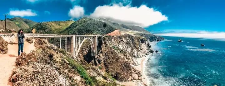 Man looks out over Pacific Ocean with dramatic Bixby Bridge behind.