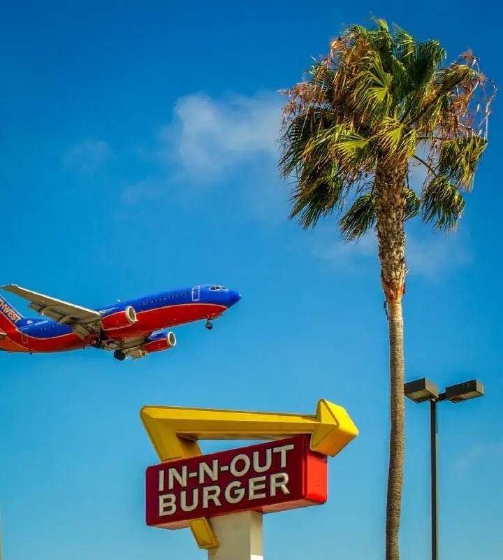Airliner flying over In-N-Out sign.