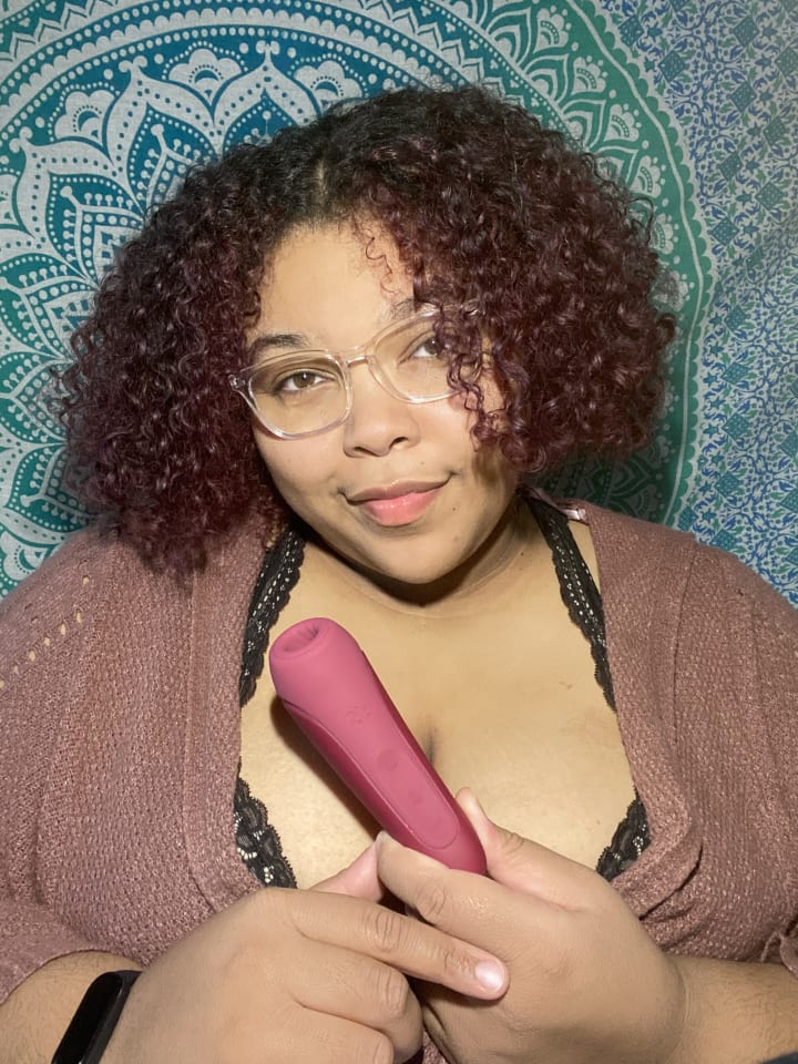 This toy I will say is a new favorite of mine. I was nervous before I started using it because I never had a suction toy before. I didn't know whether my clit was going to get sucked up forever. There were 10 levels for the air suction and five levels for the vibrator. I am able to have both the air suction and vibration on at the same time. The feel of the toy is great. The silicone material makes it safe for internal and external use. Curvy is also easy to use and is shaped to conform to my body. Curvy is pretty strong! She starts out slow and safe and with each level she gets stronger. I wanted to utilize Curvy everywhere where I was able to get pleasure. I first started on my breasts. The suction felt like, well, as one would think -- being sucked on. I had to raise the level to the highest setting to get the best feeling. I didn't use the vibrator levels, I was just fine with sucklings. Next, I went down and used the suction on my clit. I turned the toy off first before going down so that I wouldn't be surprised. The first level is on and of course, it's nothing. Easy. But that suction though?! Ooh, I was feeling amazing. I got to level five before I came. It was great. Like on a level from 1-10 with my orgasm, I'd give it a strong eight in a half. I didn't know what to expect but was low key upset that I couldn't get to level 10.
