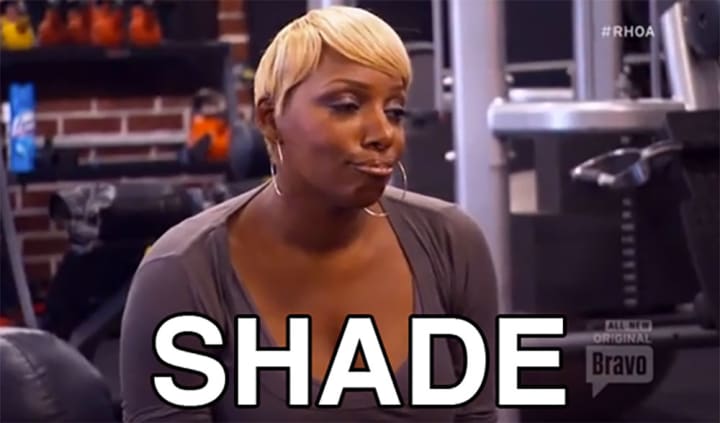 Shade, like reading developed from reading a person. Rather than the aim to insult, shade involves the medium of backhanded compliments. An example is to suggest that someone's beautiful dress makes people almost forget that she has a five o'clock shadow. Oh girl, the Shade of It All!!