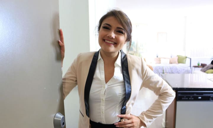 The scene takes place in the POV perspective as a potential buyer sets up a meeting to see Adria about possibly renting/buying an apartment. When he turns up Adria answers the door looking gorgeous in her office clothes. It appears the pair know each other from high school and had a dramatic date at the prom. Just Adria's general mannerisms could make a viewer fall in love with her. She's just very cute and her bright white smile is enough to make a guy blush. It comes out that the guy looking at the property had actually left the prom with another girl and stood Adria up. The reason he was coming to the property today was an opportunity to reconcile with the gorgeous brunette. It seems like that might be on the cards as Adria is even willing to cancel an appointment she has so the pair have time to catch up with each other. It's all very natural and believable if a bit too 'nicey nicey.'