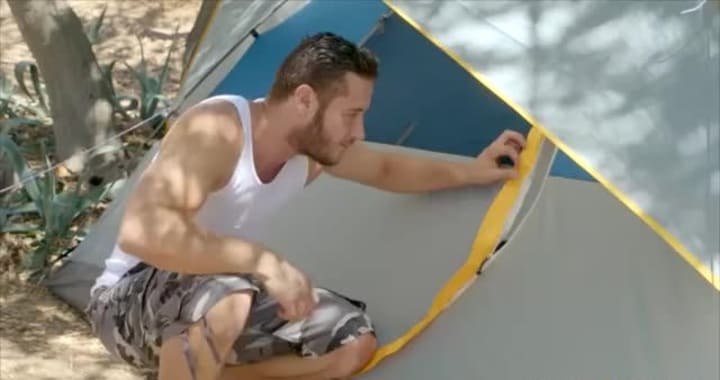 After his buddy leaves, Danny continues to relax in his chair until he hears moans coming from one of the tents next to him. He sneaks a peak and it's his buddy's girlfriend Dillion masturbating. Danny clearly likes what he sees and moves in for a closer look trying not to alert Dillion. Not really into female masturbation but Dillion does look nice with her breasts hanging out of her bra.