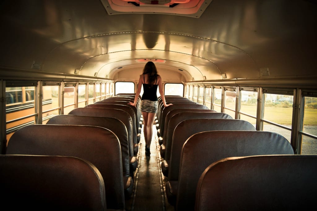 When the bus stopped outside the boys' school I’d get up and join the line of girls queueing in the aisle. There we’d stand in our PE kit, butts pushed out and flicked a little up and to the side, as if asking the world in general what it was looking at even though we knew full well any interest in us had to do with what was half-hidden under our school blazers. Once I’d gone up there with my skirt tucked in, and I’d never lived that down!