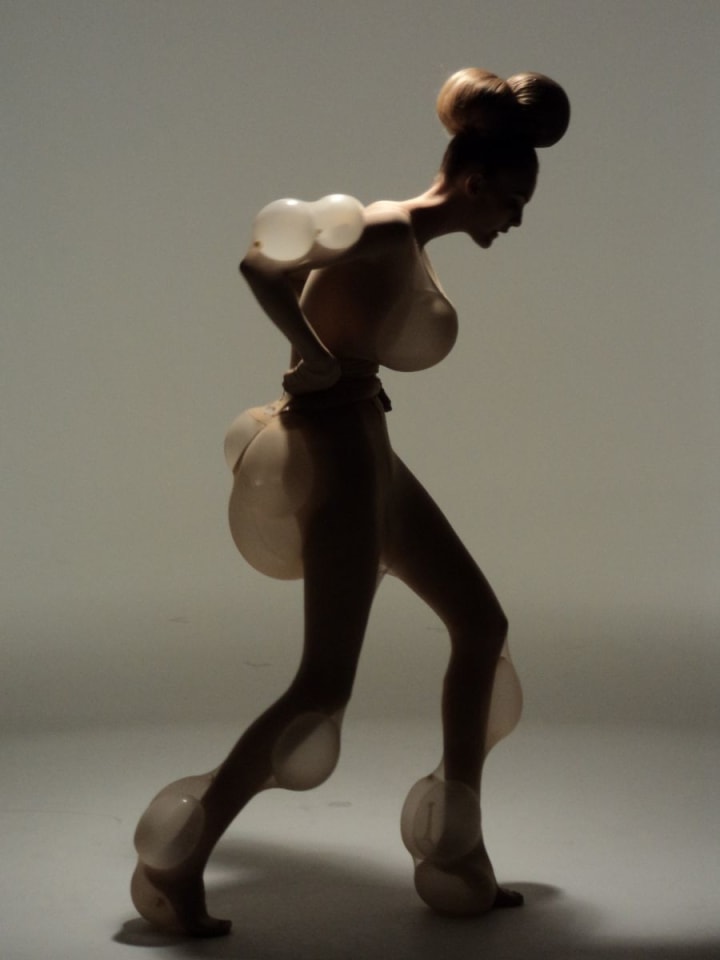 Lucy McRae and Bart Hess make up the collaborative effort known as Lucyandbart. They create an imaginary and transformed physical body. Using inflated balloons and rubber materials their work is breathtaking in its technical beauty and underlying message. The often shocking realism of their work leaves one with conflicting emotions. By stripping the silhouette of its human emotions or expressions, the bubbled balloons are both fascinating and off putting at the same time.