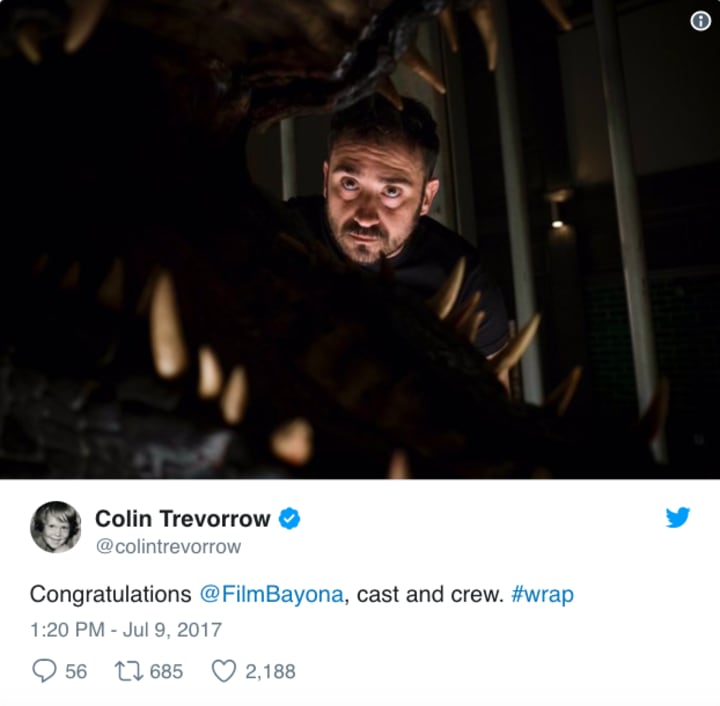 We all remember how director Colin Trevorrow engineered the Indominus Rex for 2015's film, but now it looks like Bayona is planning on one-upping the situation. Although Trevorrow is still signed on as co-writer, the proverbial dinosaur eggs are now in the hands of Bayona. Production has just wrapped on the film, and Trevorrow shared a snap to celebrate. The tweet shows a particularly stoic looking Bayona staring into the jaws of a ferocious-looking dinosaur. While it could easily be the classic jaws of Rexy the infamous returning T-Rex, fan-site Jurassic Outpost isn't quite so convinced.
