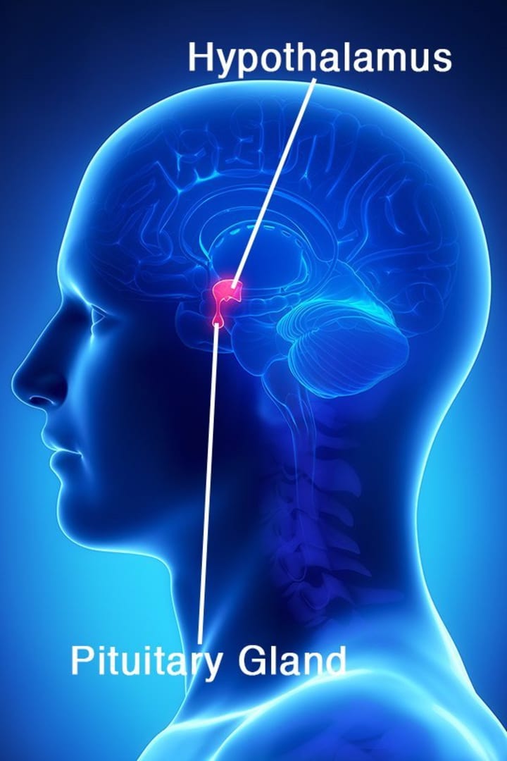 The hypothalamus is a section of the brain responsible for hormone production. The hormones produced by this area of the brain govern body temperature, thirst, hunger, sleep, circadian rhythm, moods, sex drive, and the release of other hormones in the body.