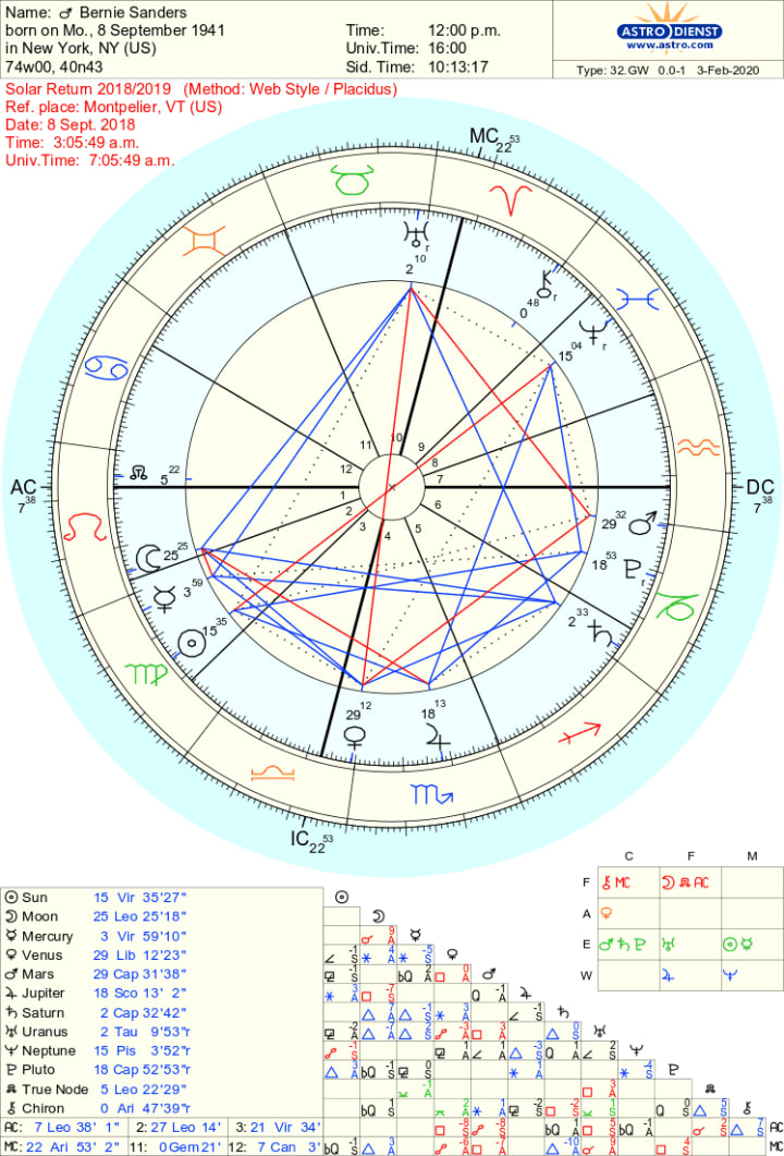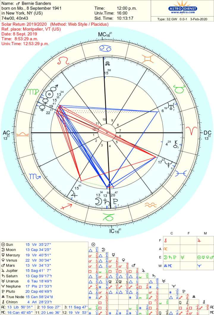 Bernie Sanders’ current Solar Return chart (2019-2020) should give us some clues as to how he’ll do in primary.