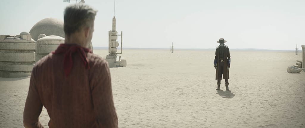Din was brought into Book of Boba Fett during “Chapter Five: Return of the Mandalorian,” after having offered to help Fett in his war against the Pyke Syndicate, who was attempting to establish dominance on Tatooine and continue their profitable spice trade. Din sought out Cobb in the next episodde to persuade him and the citizens of Freetown to join the fight against the Pykes. Cobb reluctantly agreed to talk to the townspeople. However, before he could call a meeting, he was confronted by none other than the bounty hunter Cad Bane, who warned Cobb that they would be punished if they continue to oppose the Pykes. As Cobb was unwilling to accept the deal, the encounter turned into an old-fashioned showdown between the grizzled marshall and the cunning bounty hunter. Unfortunately, both Cobb and his deputy were seemingly gunned down by Cad Bane. Without the armor to protect him, Cobb was presumed dead, another casualty of the Pyke's deadly power play on Tatooine.