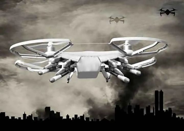 Drone technology and transhumanism robots act as military surveillance