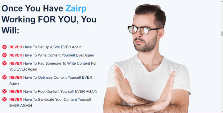 I know it’s hard to believe but once you plug-in your sites to Zairp, it’ll literally do everything for you. It’ll set up your sites, write content, optimize that content, post that content and syndicate that content for you.