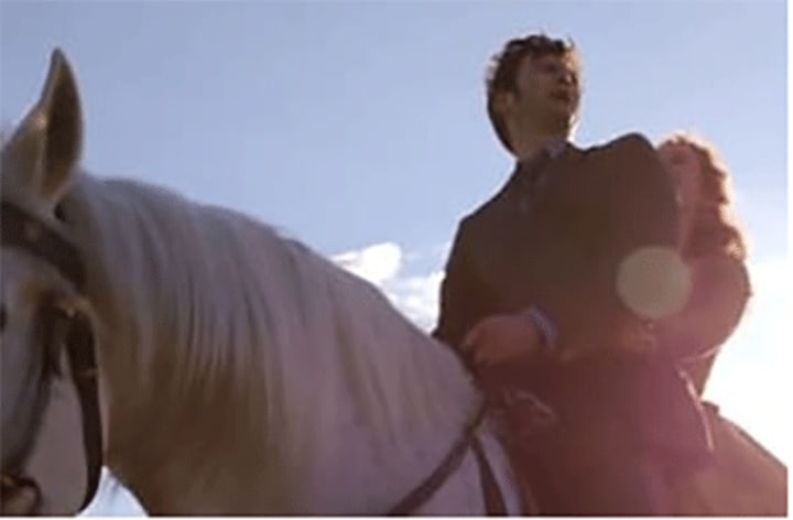 "Stop following me! I'm not your mother". Always will be a memorable line. The 10th Doctor said this line to a horse (Arthur) in the episode "The Girl in the Fireplace". Since then he has kept the horse. We assume in the TARDIS somewhere. Well in the 50th Special the Doctor rides out of his TARDIS on a horse. Yes, it's Arthur! Good to see you again.