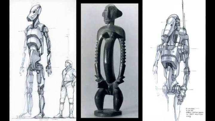 He later looked at African sculptures and used those as inspiration for the battle droids. He made them look like white skeletons to make them somewhat scary, and there was this idea that they were shaped like their makers. (The design for these makers would go on to be reused for the Geonosians in Episode II - Attack of the Clones.) Lucas vetoed Chiang's idea of the droids having jetpacks, so Chiang thought outside the box and gave them what were essentially "motorcycle choppers." This evolved into the speeder Darth Maul would use, and the battle droids were then given jet ski-inspired speeders. After a year, the battle droids became tan, and Chiang was asked to design an even more robotic droid. He took the ideas of a walking tripod and a wheel spider and ROLLED with it. (Sorry.) This, of course, became the Droideka.