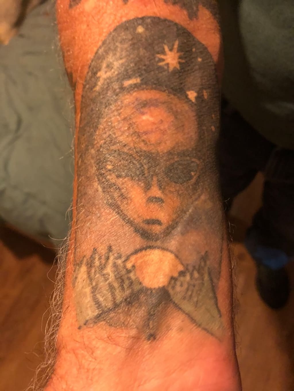The next thing I experienced was awakening from a deep sleep state in the same chair in which I was sitting. Being in what I can only describe as a daze, I gazed over at the alarm clock which at that time read 2:57 a.m. While struggling with gathering my thoughts, I became aware of an intense burning sensation on my right forearm, which to my amazement, was a tattoo resembling an alien grey. (Pictured above) At that point, I was unsure whether I was dreaming or awake, literally sitting beside myself, (no pun intended).