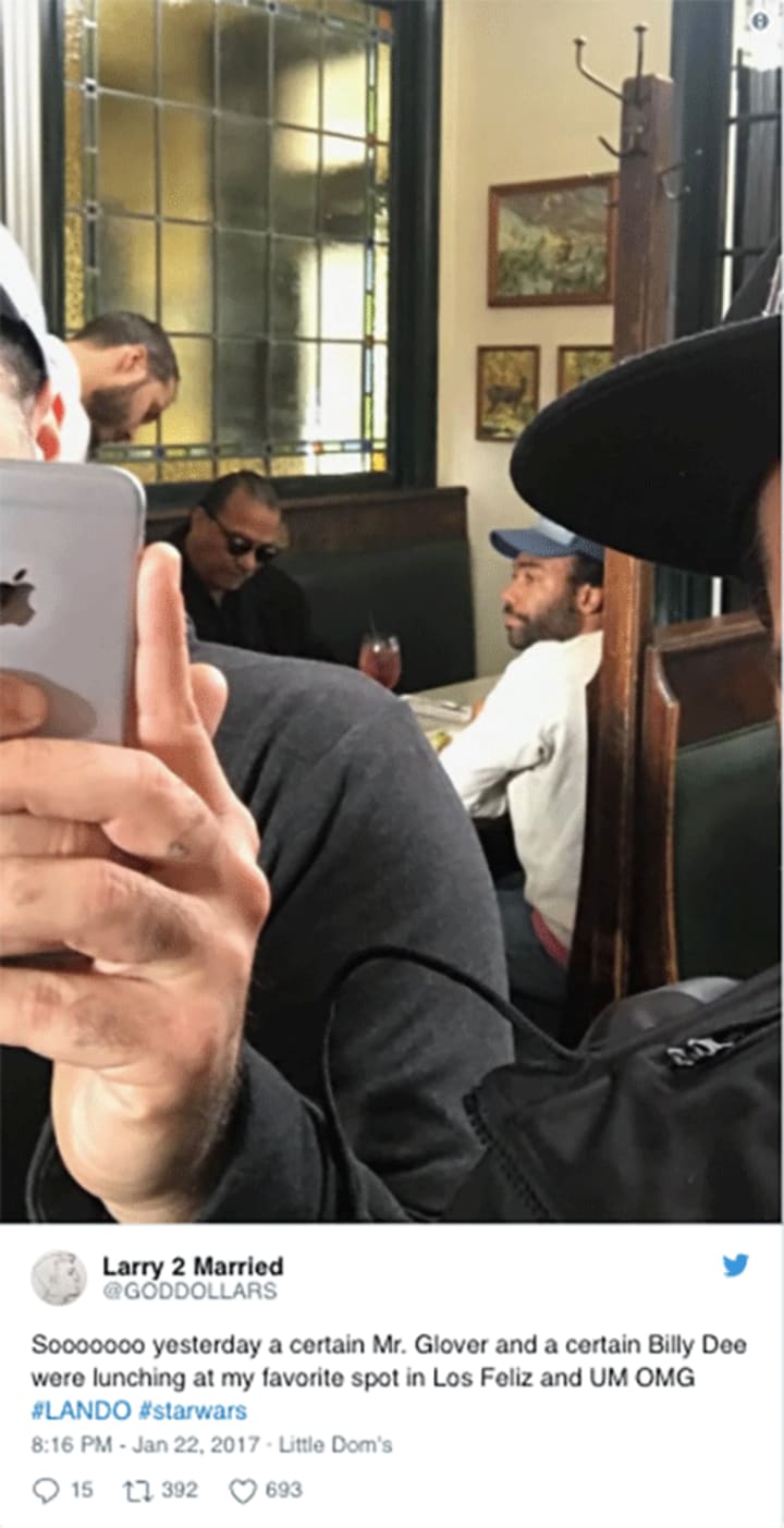 Clearly keen to live up to the legacy of Lando, it was a case of Landos who lunch as #DonaldGlover was spotted dining with original actor Billy Dee Williams. Glover will take over the part from Williams, who was last seen in the role as cloud captain Calrissian in 1983's Return of the Jedi. Glover could just be telling Williams how he "Lando-ed" the part for the upcoming #HanSolo anthology film, but could it mean something more?
