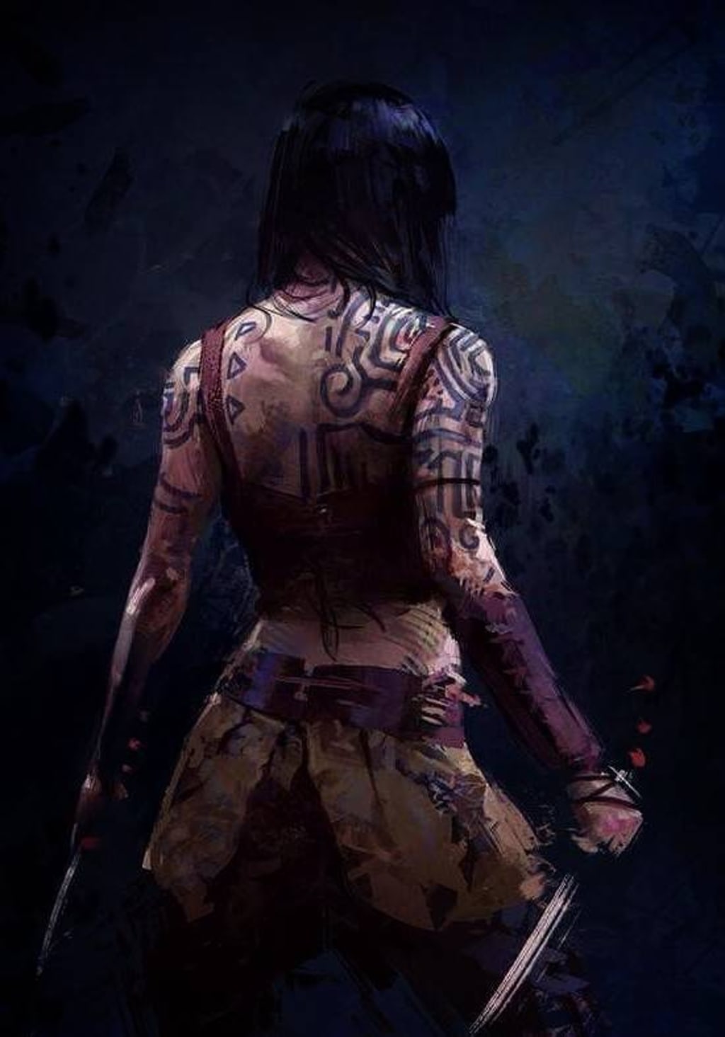 The locals of the Enchanted Forest know little of their culture. This has led to the spread of many lies revolving around their societies—such like those who believe them to be cannibals or incest-like. What little is known about their culture is what can be observed from the forests. Practises such as mass sacrifices, and blood rituals can be seen occasionally. The Faesiul are also famed for their self adornment of runic tattoos; women use Black and Red inks, whilst the men use Yellow and Khaki Green inks. These tattoos are believed to tell stories of the barer who cloaks themselves in them. These tattoos can represent their name, family, bloodline, tribe role and notable kills/successes they have made.