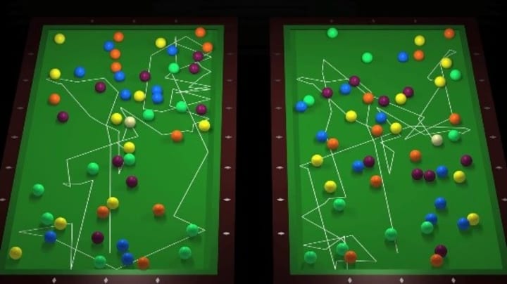 Another example of the chaos theory is the billiard table, with 49 coloured balls and one white ball.