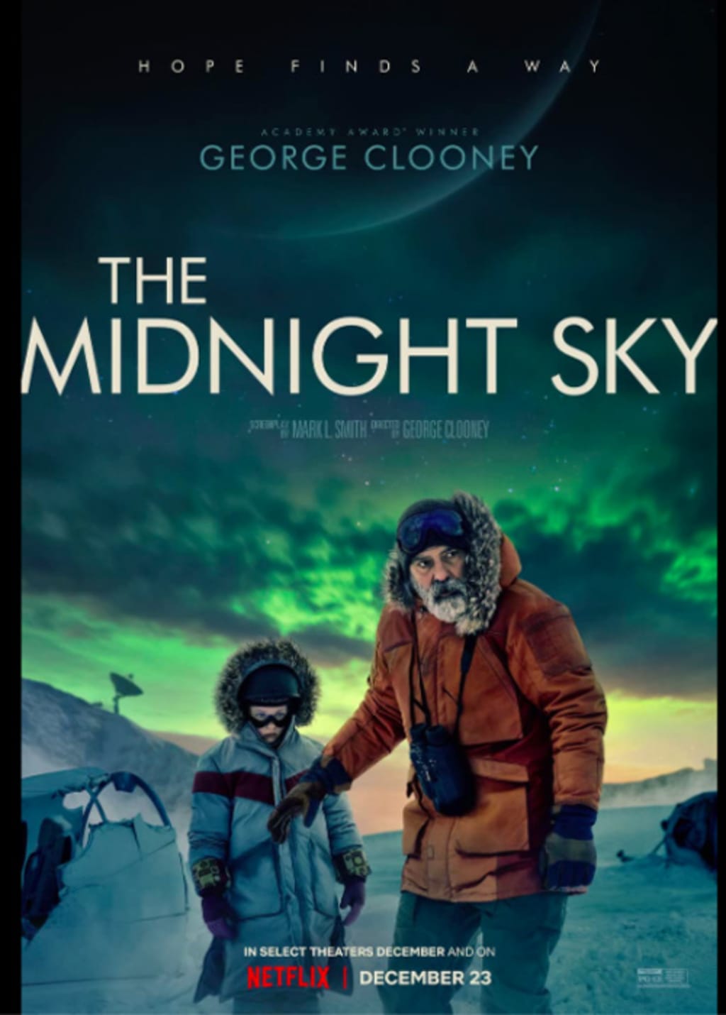 The idea of a spaceship returning to a dying Earth -- an Earth that was fine when the ship took off -- as at least as old Arch Oboler's 1956 Broadway play Night of the Auk. That was a masterpiece, too. It's a powerful theme, one that combines the heights and the deadly failures of human civilization. I haven't read the 2016 novel by Lily Brooks-Dalton, Good Morning, Midnight, on which Mark L. Smith's screenplay is based, so I can't tell you who deserves credit for what. But I can say the narrative was powerful and plausible, and very well directed by Clooney,