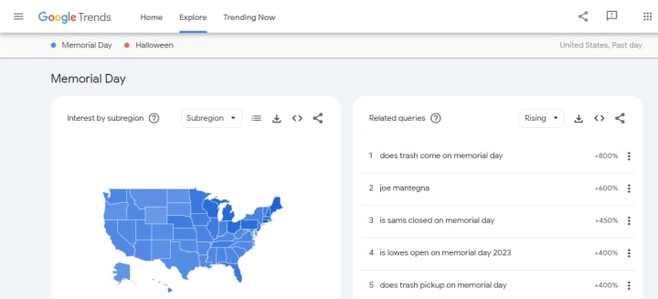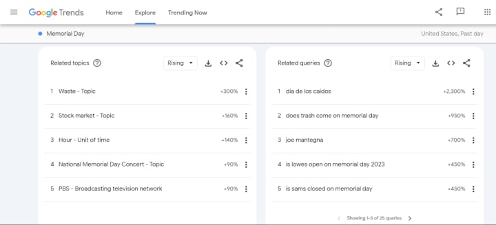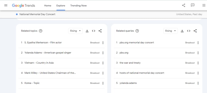 Step-3: For more detailed research, you can further niche down to trending topics and queries by clicking on them. (In the following screenshot, you can see the related topics and queries of the National Memorial Day concert, which is the sub-category of Memorial Day).