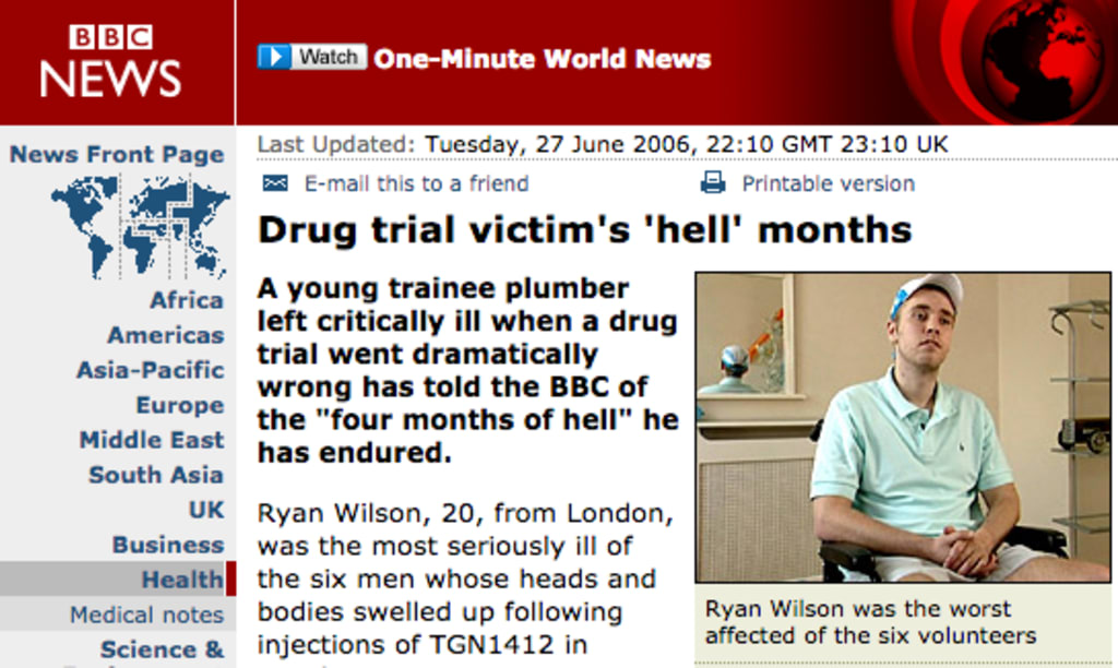 Dr. Bradford: "I kept reading through the document and all the detail about the drug. There was an unlikely possibility of a cytokine storm; an extreme autoimmune reaction."
