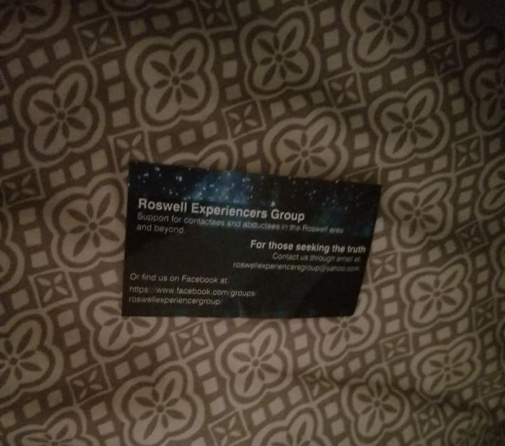 There, between the pillows, was the business card for the alien contact support group I started. And there was the answer. I was pregnant, but I am not any longer. Oddly enough, my husband had a dream that night that we had a son and we were sad because he was leaving. In the dream the boy was in some sort of incubator tank full of liquid. I don’t think it a coincidence we both dreamed about a son at the same time.