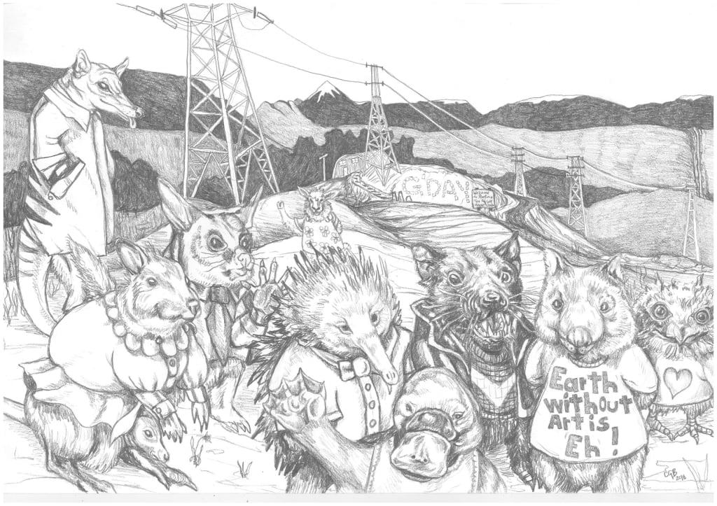 Luckily there was no traffic that quiet morning and they finally came to a small town. It was Poatina. There was an instinctive understanding between them that they needed to seek out some Humans. The throng that were walking crossed the grid at the entrance to the village and found an area of grass between some buildings beside the main street. Most of them sat. Some of the Humanimals were flyers. They landed on the roof of the community hall or on a few of the houses nearby. It was still early but the noise was waking people up. Humans looked out their windows or their doors. It was all quite a shock! From the strange crowd a few individuals stood. A tall creature, dog-like with a long thick tail and stripes on his back, stepped out into the main road in front of the community hall. Another followed, stocky and barrel shaped and brown. A third flew down from the nearby roof, an insectoid with wings.