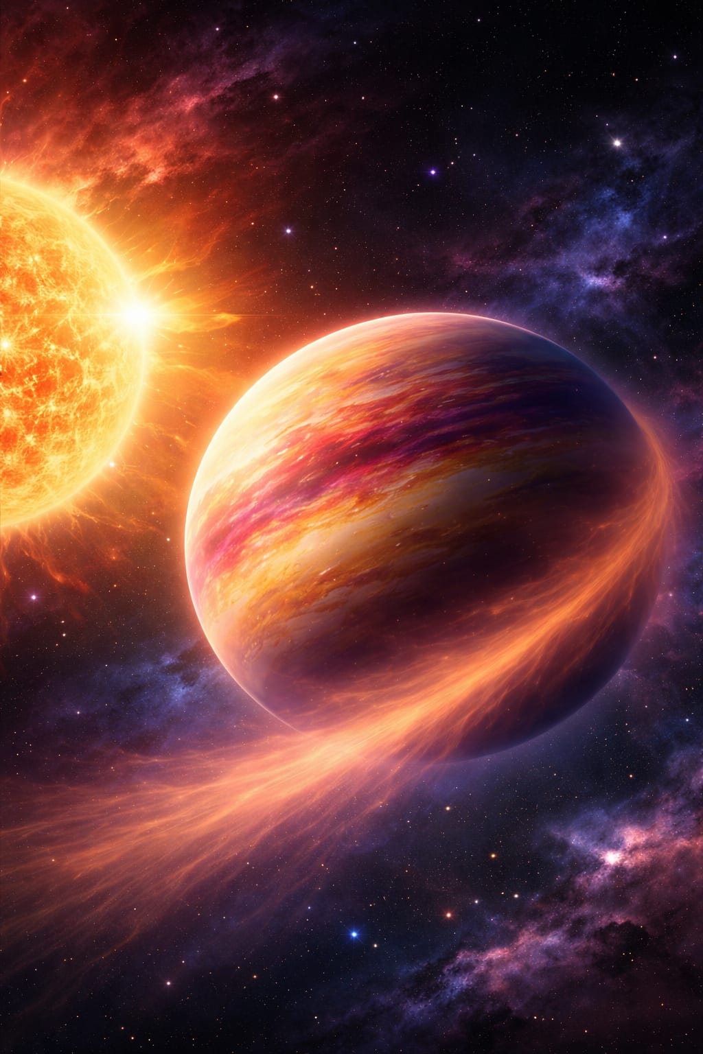 Unlike solid planets, gas giants have no sharp surface boundary. Their atmospheres gradually thin out with altitude. When heated, these gaseous layers expand outward, dramatically increasing the planet’s observed radius. In some extreme cases, the atmosphere becomes so extended that hydrogen gas escapes into space, forming long, comet-like tails trailing behind the planet.