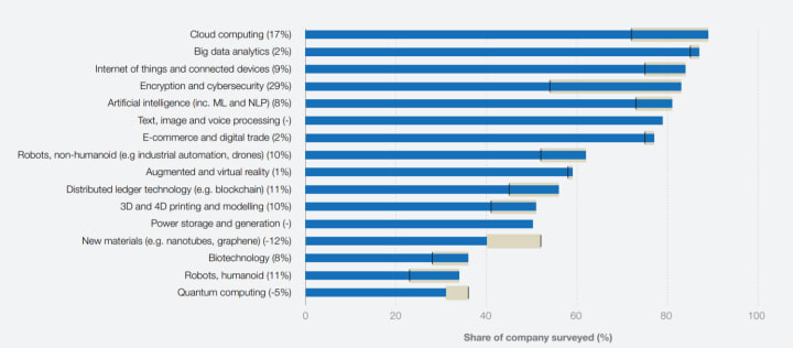 If we are to go by World Economic Forum’s Future of Jobs Report 2020, then Cloud computing, big data and e-commerce remain high priorities of the companies, but there's also been a significant rise in interest for encryption, non-humanoid robots and artificial intelligence.